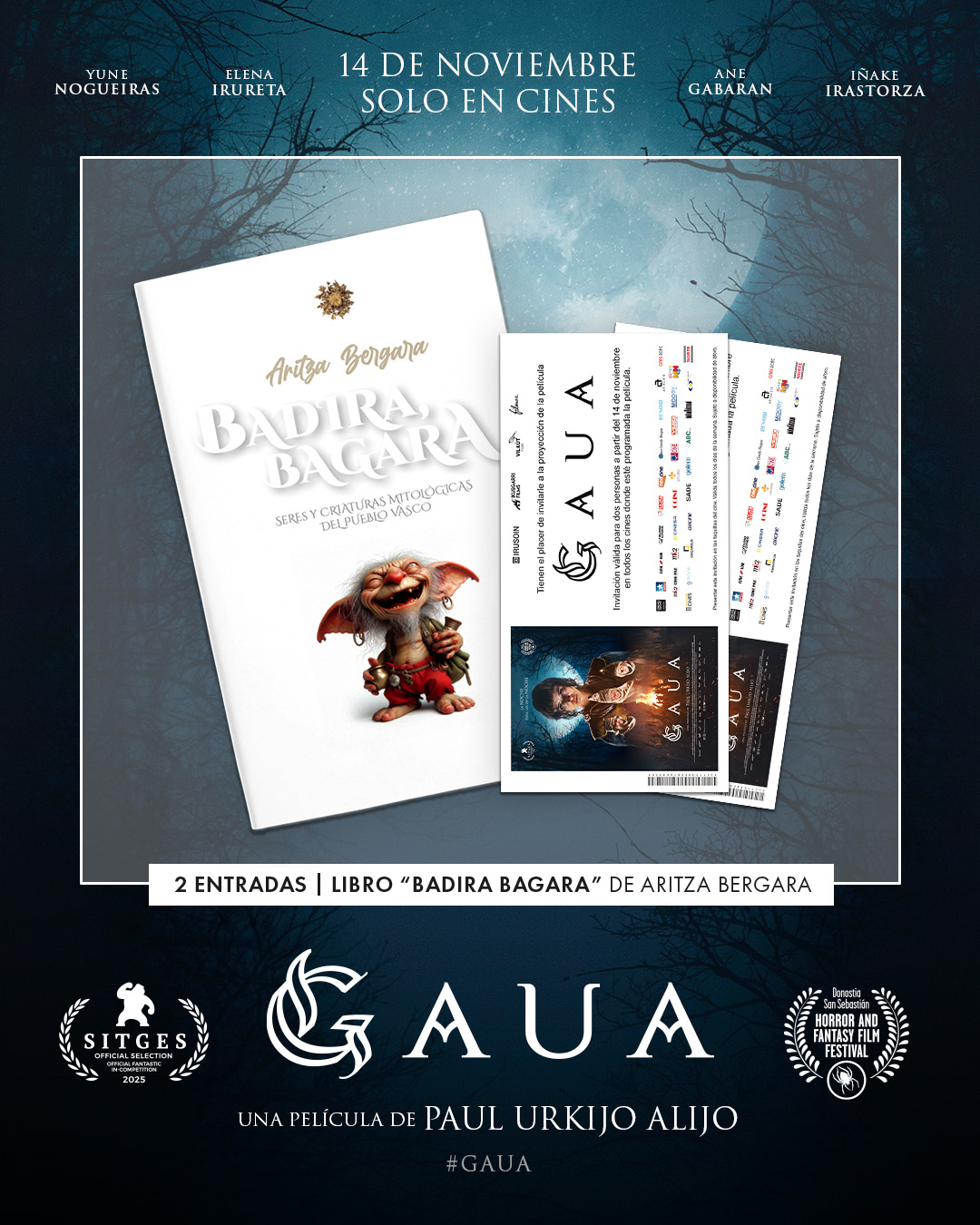 Sí, sí, has leído bien. Sorteamos tres premios consistentes en entrada doble para ver la película "Gaua", de Paúl Urkijo, junto con un ejemplar del libro "Badira, bagara. Seres y criaturas mitológicas del Pueblo Vasco" de Aritza Bergara, con dedicatoria si así lo solicitas. ¿Qué tienes que hacer para participar? Entra en mi perfil de Instagram (@aritzabergara), sígueme sin aún no lo haces, dale "Like" a la publicación y compártela en tu muro, para llegar a más gente. Así de sencillo. Gracias por participar, por difundir y... ¡¡¡Mucha suerte en el sorteo!!!